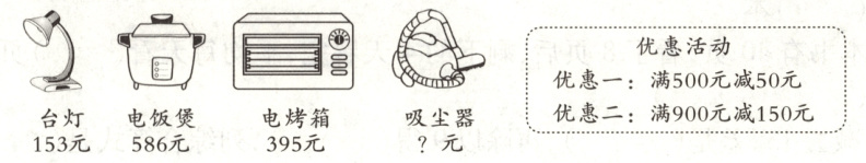 【点拨】吸尘器的价格:900 - 82 - 586 = 232(元),优惠后需付:586 + 232 + 153 - 150 = 821(元)。