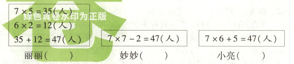 (1) 丽丽、妙妙和小亮分别用不同的方法算出了表演集体舞的人数。他们中谁算得对?在算得对的下面画“√”。