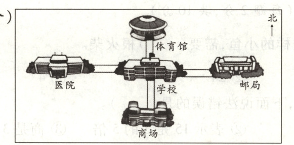 医院在学校的( )面;学校在体育馆的( )面;商场的( )面是学校;学校在( )的东面;邮局在( )的东面。