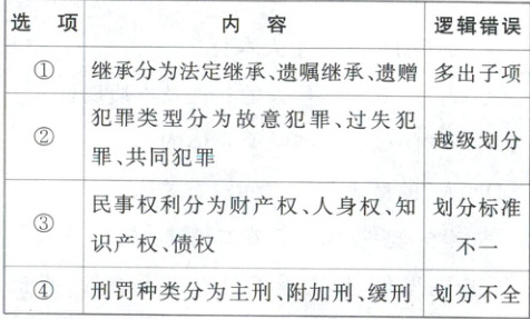 4.A 【解析】本题考查明确外延的方法。继承分为法定继承和遗嘱继承,遗赠不属于继承,犯了“多出子项”的错误,①正确;财产权、人身权、知识产权是按照民事权利的内容或性质进行的划分,将债权与财产权、人身权、知识产权并列作为民事权利的子项,在划分标准上是不一致的,即犯了划分标准不一的逻辑错误,③正确;将共同犯罪与故意犯罪、过失犯罪并列作为犯罪类型的子项,实际上混淆了不同的划分标准,而不是犯了“越级划分”的逻辑错误,②排除;划分不全通常指的是在划分时遗漏了某些应该包括在内的子项,在这个例子中,并没有遗漏任何刑罚种类,而是将一种刑罚的执行方式错误地当作了刑罚种类来划分,实际上犯了“多出子项”的逻辑错误,④排除。