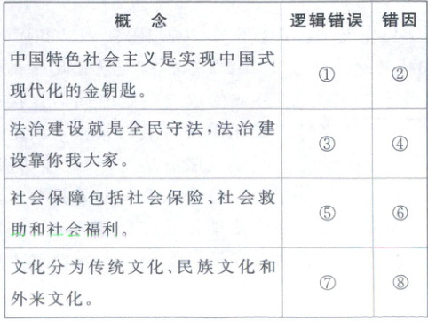 5.①比喻定义。(1分)②用“金钥匙”这一比喻替代对概念本质属性的揭示,未明确中国特色社会主义的内涵。(2分)③定义过窄。(1分)④将“法治建设”仅限定为“全民守法”,忽略了立法、执法、司法等核心环节,缩小了被定义项的外延。(2分)⑤划分不全。(1分)⑥社会保障的完整外延应包括社会保险、社会救助、社会福利和社会优抚四部分,此处遗漏了“社会优抚”。(2分)⑦划分标准不一。(1分)⑧传统文化、民族文化和外来文化可能有交叉,比如民族文化可能包含传统文化和外来文化,导致划分标准混乱,出现多出子项或子项相容的情况。(2分)