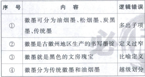 2.A 【解析】本题考查明确概念的方法。徽墨按原料和工艺分为油烟墨、松烟墨、炭黑墨等,传统墨不属于此分类体系,该表述犯了“多出子项”的错误,①正确;定义不能用比喻,否则,就会犯“比喻定义”的逻辑错误。而“徽墨就是黑色的文房瑰宝”犯了比喻定义的逻辑错误,③正确;“徽墨是古徽州地区生产的书写墨锭”这一定义中,定义项超过了被定义项的外延,犯了定义过宽的逻辑错误,②排除;“徽墨分为传统徽墨和油烟墨”犯了划分标准不一的错误,不是越级划分,④排除。