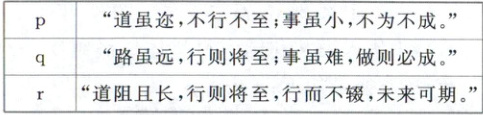 7.A 【解析】本题考查正确运用假言判断。p意思是:即使是再近的路,不走也不能到达;即使再小的事,不去做也不可能完成。p使用了必要条件假言判断断定了“行”与“至”、“为”与“成”之间的关系,①正确。q的意思是:路途虽然遥远,但是只要一直走就会有走到头的一天;事情虽然很难完成,但是只要做下去就会有成功的一天。q使用充分条件假言判断断定了“行”与“至”、“做”与“成”之间的关系,②正确。r的意思是:道路险阻而又漫长,但是走的话就会到达目的地,如果可以坚持不懈,那么美好的未来就值得期待。r使用了充分条件假言判断断定“行”与“至”的关系,③排除。p、q、r使用的都是复合判断,而关系判断是一种简单判断,④排除。