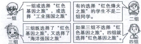 ③若三组描述为假,能推出“三组或没选择‘红色基因之旅’,或没选择‘海洋强国之旅’”为真