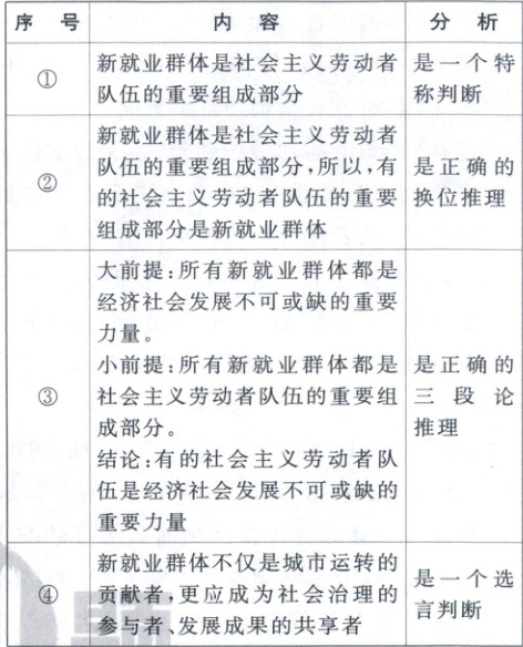 10.C 【解析】本题考查性质判断换位推理、三段论推理。“新就业群体是社会主义劳动者队伍的重要组成部分,所以,有的社会主义劳动者队伍的重要组成部分是新就业群体”,符合换位推理的逻辑规则,是一个正确的换位推理,②正确;材料中大前提“所有新就业群体都是经济社会发展不可或缺的重要力量”、小前提“所有新就业群体都是社会主义劳动者队伍的重要组成部分”、结论“有的社会主义劳动者队伍是经济社会发展不可或缺的重要力量”,符合只有三个不同的项、中项在前提中至少周延一次、前提中不周延的项在结论中不得周延等三段论推理的规则,是正确的三段论推理,③正确;“新就业群体是社会主义劳动者队伍的重要组成部分”表述的是新就业群体作为整体(全称)的属性,应视为全称判断,①排除;“新就业群体不仅是城市运转的贡献者,更应成为社会治理的参与者、发展成果的共享者”,该内容使用“不仅……更应……”结构,表达的是并列关系,属于联言判断,而不是选言判断,④排除。