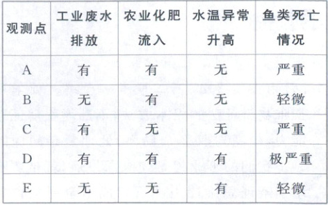 (1)对比观测点 A、B、C 的数据可以发现工业废水排放与鱼类死亡之间的因果关系,请运用求异法对此加以分析。(9 分)