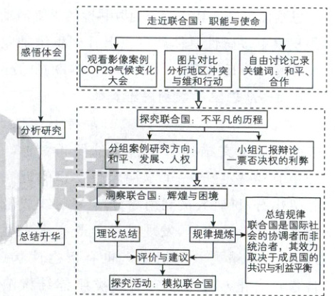 【解析】本题考查体会认识发展的历程。关键信息①:“走近联合国:职能与使命”,观看影像、图片对比、讨论记录→从感性具体到思维抽象:阐述学生通过观看影像、图片对比等活动,感知到关于联合国职能和使命的感性具体的认识,是直观的整体表象。关键信息②:分组案例研究、小组汇报辩论→从感性具体到思维抽象。关键信息③:理论总结、规律提炼→从思维抽象到思维具体。