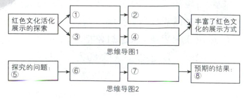 【解析】本题考查创新思维。思维导图1:关键信息①:依托互联网、人工智能、声光电等现代科学技术,积极探索红色文化活化展示的新方式→从联想思维的角度,说明湖南省将人工智能等科学技术与革命文物展示建立联系。据此填写①和②。关键信息②:以科技手段还原真实的历史场景;邀请离休干部走上荧屏“云宣讲”;利用数字多媒体等,直观、立体展现1320余件文物背后的感人故事→从发散思维的角度,说明湖南省围绕红色文化活化展示,让历史场景、人物塑造、资源利用“活起来”,据此填写③和④。