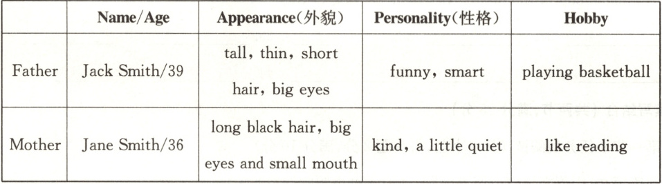 Family means “Father and mother I love you!”在我们的成长过程中父母永远都在默默守护和支持我们。假如你是李华,请按下表提示,自豪地向大家介绍你的父母。