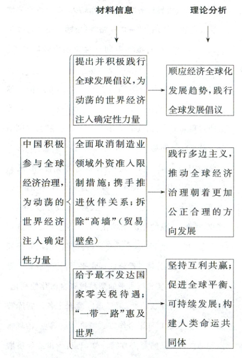 【解析】经济全球化 本题是说明类主观题,要求说明中国积极参与全球经济治理,为动荡的世界经济注入确定性力量,知识范围限定为经济全球化,可考虑结合材料中中国积极参与全球经济治理的实践,对接教材相关知识思考作答。