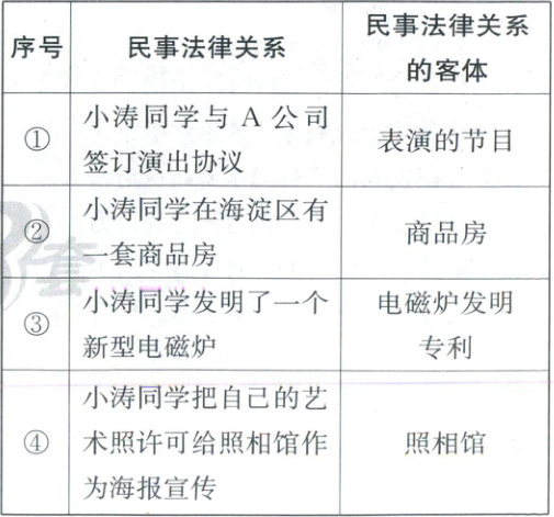 13 C 民事法律关系 小涛同学与A公司签订演出协议,其民事法律关系的客体是表演节目的行为,①错误;小涛同学把自己的艺术照许可给照相馆作为海报宣传,民事法律关系的客体是人身利益,④错误。故答案选C。