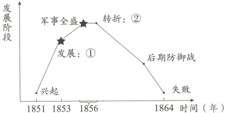 9. [时空观念]题图反映太平天国运动发展过程中的大事件,其中①②处分别指的是(