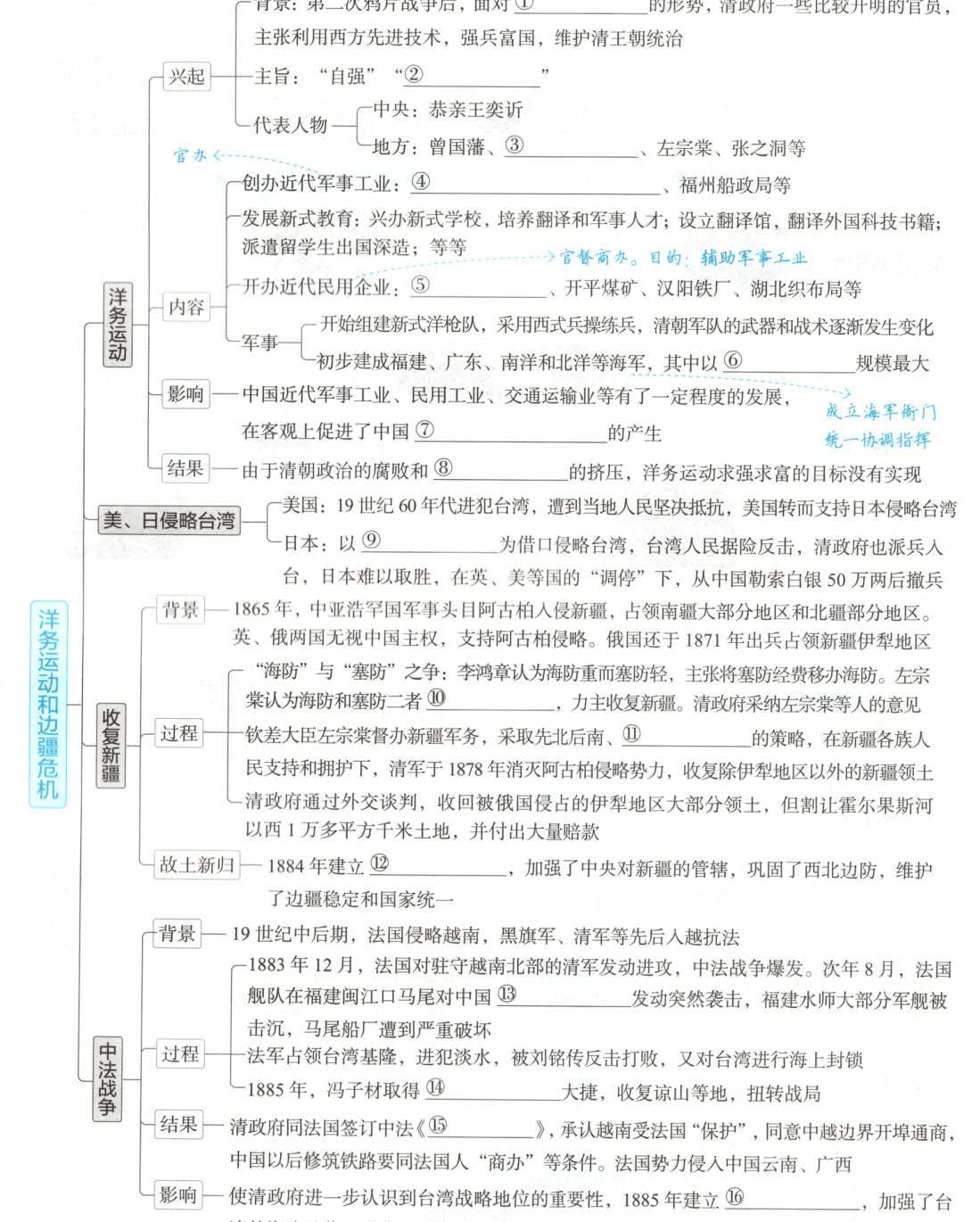 ①内忧外患 ②求富 ③李鸿章 ④江南制造总局 ⑤轮船招商局 ⑥北洋舰队 ⑦民族资本主义 ⑧外国势力 ⑨琉球事件 ⑩并重 ⑪缓进急战 ⑫新疆行省 ⑬福建水师 ⑭镇南关 ⑮中法新约 ⑯台湾行省