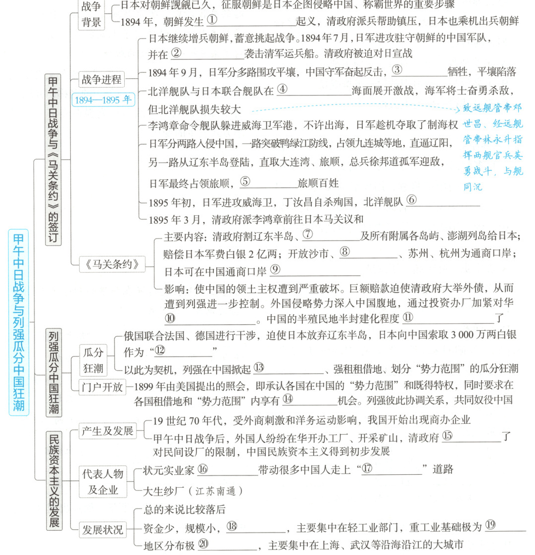 ①东学党 ②丰岛 ③左宝贵 ④黄海 ⑤屠杀 ⑥全军覆没 ⑦台湾全岛 ⑧重庆 ⑨开设工厂 ⑩经济侵略 ⑪大大加深 ⑫赎辽费 ⑬割占土地 ⑭均等贸易 ⑮放宽 ⑯张謇 ⑰实业救国 ⑱技术差 ⑲薄弱 ⑳不平衡