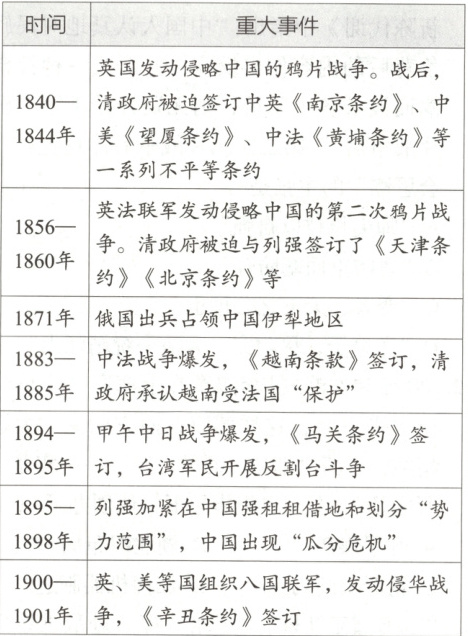 论述:19世纪中叶起,列强接连发动两次鸦片战争、甲午中日战争、八国联军侵华战争等,逼迫清政府签订一系列不平等条约,割让领土、赔款通商。俄国也趁机吞并大片中国领土。中国主权丧失,经济崩溃,民族危机空前加剧,逐步从封建社会沦为半殖民地半封建社会。清政府的腐朽无能暴露无遗,为近代救亡运动埋下伏笔。