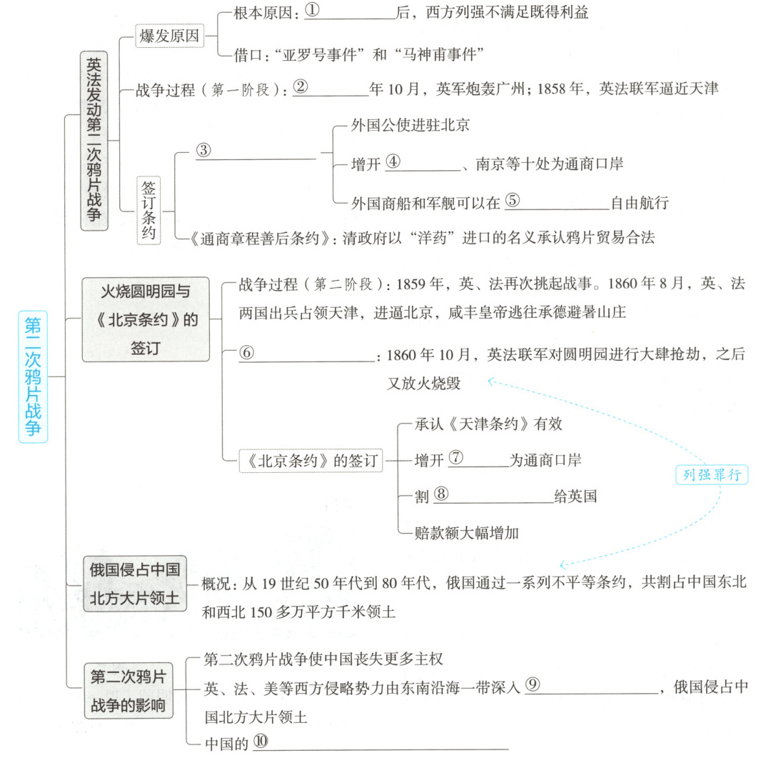 ①工业革命;②1856;③《天津条约》;④汉口、南京;⑤长江各口岸;⑥火烧圆明园;⑦天津;⑧九龙司地方一区;⑨长江中下游地区;⑩半殖民地化程度进一步加深