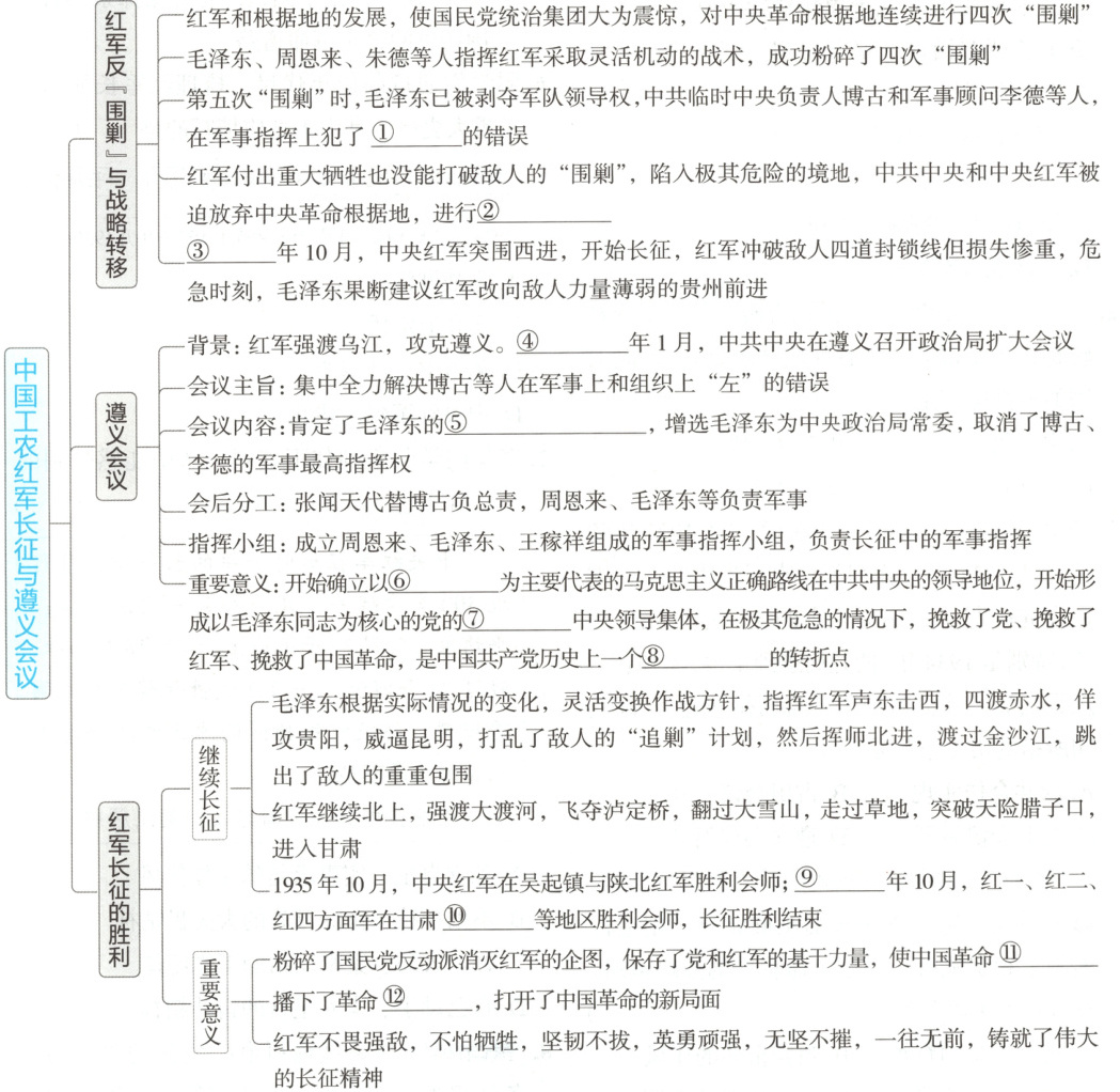 ①“左” ②战略转移 ③1934 ④1935 ⑤正确军事主张 ⑥毛泽东 ⑦第一代 ⑧生死攸关 ⑨1936 ⑩会宁 ⑪转危为安 ⑫种子
