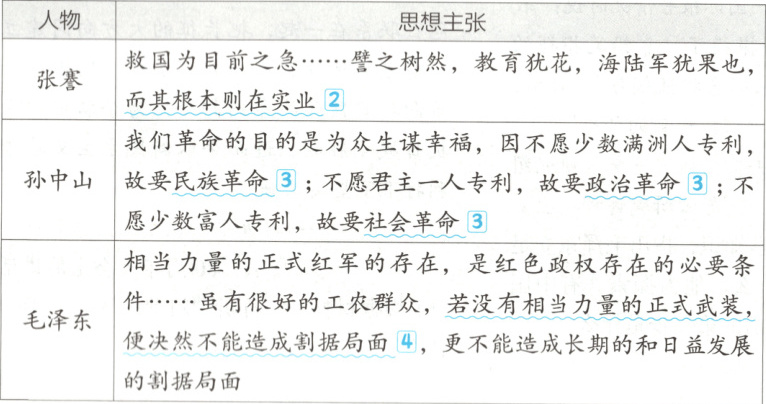 张謇在“实业救国”思想下创办大生纱厂,他的思想促进了近代中国民族工业的发展。孙中山提出的“三民主义”思想成为辛亥革命的指导思想。辛亥革命推翻了清王朝的统治,拉开了中国完全意义上的近代民族民主革命的序幕。毛泽东把马克思列宁主义基本原理同中国具体实际相结合,创造了“工农武装割据”局面,指引中国共产党取得了新民主主义革命的胜利。上述思想都促进了近代中国的社会转型,成为国家发展和社会进步的理论指导。(6分)