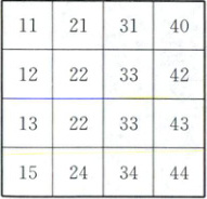 4. 24 112 由题意知,第一列有4个方格可选,第二列有3个方格可选,第三列有2个方格可选,第四列有1个方格可选,所以共有$4×3×2×1 = 24$(种)选法.每种选法可标记为$(a,b,c,d)$,$a,b,c,d$分别表示第一、二、三、四列的数字,则所有的可能结果为$(11,22,33,44)$,$(11,22,34,43)$,$(11,22,33,44)$,$(11,22,34,42)$,$(11,24,33,43)$,$(11,24,33,42)$,$(12,21,33,44)$,$(12,21,34,43)$,$(12,22,31,44)$,$(12,22,34,40)$,$(12,24,31,43)$,$(12,24,33,40)$,$(13,21,33,44)$,$(13,21,34,42)$,$(13,22,31,44)$,$(13,24,34,40)$,$(13,24,31,42)$,$(13,24,33,40)$,$(15,21,33,43)$,$(15,21,33,42)$,$(15,22,31,43)$,$(15,22,33,40)$,$(15,22,31,42)$,$(15,22,33,40)$,所以$(15,21,33,43)$这4个数之和最大,为$15 + 21 + 33 + 43 = 112$.
