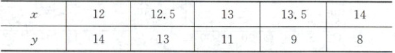 (1)$\overline{x}$ = $\frac{1}{5}$×(12 + 12.5 + 13 + 13.5 + 14) = 13,$\overline{y}$ = $\frac{1}{5}$×(14 + 13 + 11 + 9 + 8) = 11。