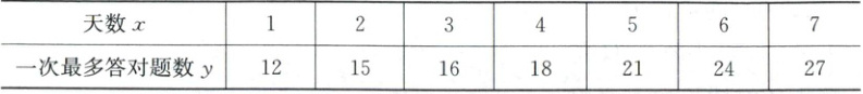 由表中数据可知该老师每天一次最多答对题数$y$与天数$x$之间是