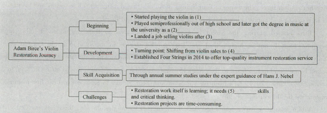 【语篇导读】本文是一篇记叙文。文章主要介绍了Adam Birce修复小提琴的工作流程、工作经历以及他对这份工作的热爱。