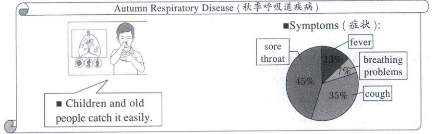 Children and old people can catch the illness easily. 45% of the people have a sore throat and 35% of them have a cough. 13% of them have a fever. Besides, 7% of the people have breathing problems. What can we do to prevent it? First, we need to do some exercise, especially for children and the old. Second, it’s necessary for us to drink enough water every day. Third, keep rooms clean and the air fresh all the time. Finally, we must see a doctor at once when we get the illness.
