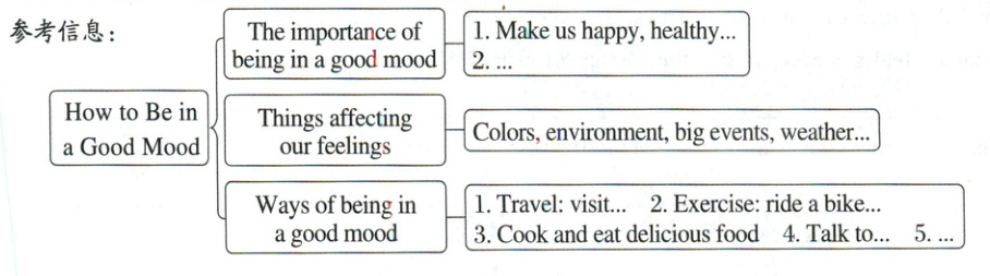 写作提优练 范文: If we are always in a bad mood, we may become sick. So it is important for us to stay in a good mood. Many things around us can affect our feelings, such as the environment, colors, big events and weather. What should we do to stay in a good mood? Here is some advice. First, visiting some scenic spots can make us relaxed. Second, if we have some problems, we should talk to our friends, parents or teachers. They will help us deal with them. Third, doing sports can make us forget something unhappy. We can ride a bike, run, swim and so on. Finally, if you like, you can cook and eat delicious food to make you happy. In a word, it’s necessary for us to stay in a good mood.