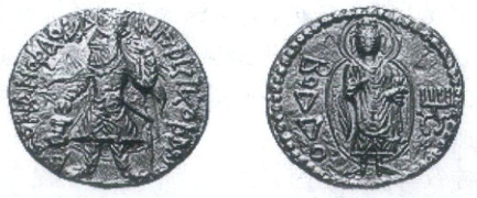 7. 历史解释[2025 河北保定期中]大月氏人西迁,建立贵霜帝国。下图为贵霜帝国时期的钱币,钱币上的铭文是希腊语,钱币正面人物为国王,左图写的是国王名字,铭文的意思是“大王”或“诸王之王”,钱币反面(右图)为印度教神灵湿婆像。从中我们可以获取的信息有(