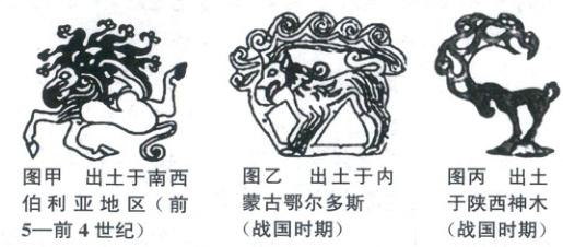 1. [2025 陕西渭南期末]下面图片所示的有角神兽是我国北方和欧亚草原地区常见的一种装饰题材。有学者认为,这种“鸟兽合一”的虚幻动物与先秦文献记载的赢秦飞廉的风神形象相吻合。这可用于说明(