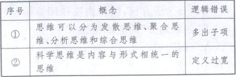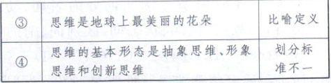 3.C 任何思维都是内容和形式的统一,但思维有科学和非科学之分,内容和形式相统一的思维不一定是科学思维,②犯了“定义过宽”的逻辑错误;③将思维比作花朵,犯了“比喻定义”的逻辑错误,均符合题意。发散思维和聚合思维是思维的动态过程,而分析思维和综合思维是思维的静态方法,它们并不是同一分类标准下的子项,①犯了“划分标准不一”的逻辑错误,排除。抽象思维和形象思维是根据运行的基本单元的不同而划分的思维的基本形态,④犯了“多出子项”的逻辑错误,排除。