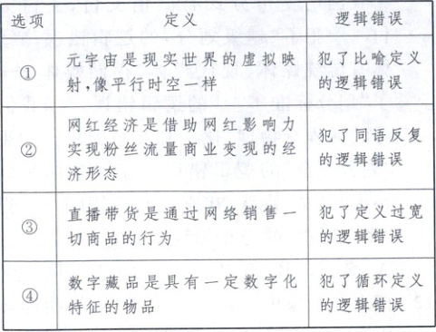 1.B 将元宇宙定义为“像平行时空一样”,这是用比喻的手法来描述元宇宙,并未真正揭示元宇宙的本质特征,犯了“比喻定义”的逻辑错误,①正确。定义项与被定义项的外延必须全同。通过网络销售一切商品的行为,外延大于直播带货的外延,犯了“定义过宽”的逻辑错误,③正确。②正确揭示了网红经济的本质,是正确定义,没有犯“同语反复”的逻辑错误,排除。定义项与被定义项的外延必须全同。具有数字化特征的物品范围很广,不一定就是数字藏品,具有数字化特征的物品的外延大于数字藏品的外延,犯了“定义过宽”的逻辑错误,而不是循环定义的逻辑错误,④排除。