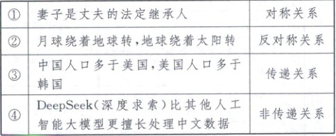 7.B 妻子是丈夫的法定继承人,妻子和丈夫是对称关系,因为丈夫也是妻子的法定继承人,①正确。中国人口多于美国,美国人口多于韩国,此为传递关系,因为中国人口多于韩国,③正确。月球绕着地球转,地球绕着太阳转是反传递关系,而不是反对称关系,②错误。DeepSeek(深度求索)比其他人工智能大模型更擅长处理中文数据,这属于反对称关系,而不是非传递关系,④错误。
