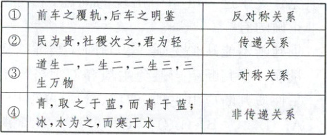 9.A “前车之覆轨,后车之明鉴”意为:前面的车倾覆的车辙印是后面的车应当以为警醒的鉴戒。“前车之覆轨”是“后车之明鉴”,但“后车之明鉴”不一定只是“前车之覆轨”,所以两者是反对称关系,①正确。“民为贵,社稷次之,君为轻”,“民……社稷……君……”是传递关系,因为按照重要性排序,“民”>“社稷”>“君”,②正确。“道生一,一生二,二生三,三生万物”,只能按此顺序顺推,不能逆推得出“一生道,二生一,三生二,万物生三”,所以这四个关系者项之间是反传递关系,③错误。“青,取之于蓝,而青于蓝;冰,水为之,而寒于水”,不能逆推得出“蓝,取之于青,而蓝于青”和“水,冰为之,而寒于冰”,所以这两对关系是反对称关系,④错误。