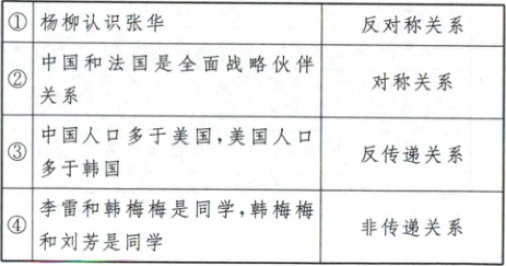 10.B 若“中国是越南的邻邦”,则“越南必然也是中国的邻邦”,“邻邦”关系是对称关系,①正确。反对称关系的定义:如果A与B存在某种关系,则B与A必然不存在该关系。“中国比越南人口多”,则“越南必然不会比中国人口多”,二者关系具有反对称性,④正确。“同志加兄弟”是对称关系,不是传递关系,②排除。非对称关系的定义:A与B存在某种关系时,B与A可能存在也可能不存在该关系。“并肩战斗、相互支持”是对称关系,不是非对称关系,③排除。