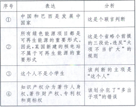 7.C “中国和巴西是发展中国家”是由“中国是发展中国家”“巴西是发展中国家”两个直言判断组成的联言判断,①正确。“所有绿色能源项目都是可再生能源的重要形式”,因此,某国新建的核电站不属于可再生能源的重要形式”,该三段论省略了小前提,即“某国新建的核电站不是绿色能源项目”。在该三段论中,大项“可再生能源的重要形式”在前提中作为全称肯定判断的谓项是不周延的,在结论中作为单称否定判断的谓项是周延的,犯了“大项不当扩大”的错误,②正确。“这个人不是小学生”,该判断的主项是“这个人”,③正确。知识产权分为专利权、商标权和著作权,著作权又分为著作人身权和著作财产权,作为子项的著作人身权和著作财产权不是母项知识产权最邻近的子项(著作权),该划分犯了“越级划分”的逻辑错误,④错误。