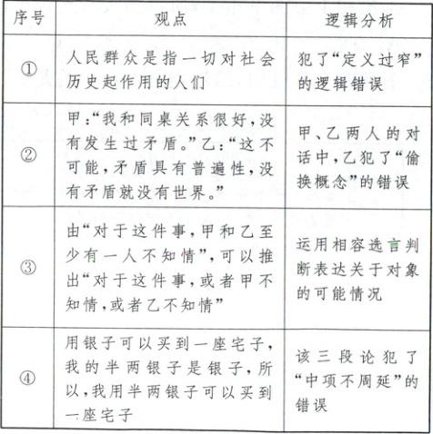 8.C 甲、乙两人的对话中,甲的“矛盾”是指矛盾的具体形式(如争吵、冲突等),乙的“矛盾”是指哲学中共性的矛盾,乙违背了思维的确定性要求,犯了“偷换概念”的逻辑错误,逻辑分析正确,②符合题意。“对于这件事,甲和乙至少有一人不知情”可以推出“对于这件事,或者甲不知情,或者乙不知情”,该观点运用相容选言判断表达关于对象的可能情况,其选言支至少有一个是真的,也可以都是真的,逻辑分析正确,③符合题意。“人民群众是指一切对社会历史起作用的人们”犯了“定义过宽”的逻辑错误,①排除。④两个前提中的“银子”概念不同,该观点犯了“四概念”的错误,而不是“中项不周延”的错误,排除。