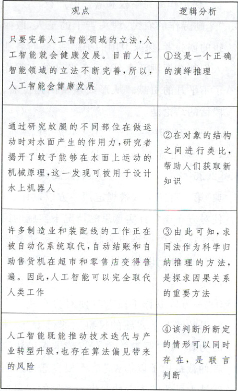 7. D 研究者通过模拟蚊腿的结构与运动原理用于水上机器人设计,属于在对象的结构之间进行类比,帮助人们获取新知识,②正确。“人工智能既能推动技术迭代与产业转型升级,也存在算法偏见带来的风险”同时肯定了两种并存的情形,是联言判断,④正确。“只要完善人工智能领域的立法,人工智能就会健康发展”属于充分条件假言命题,“目前人工智能领域的立法不断完