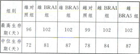 8. 为了进一步探究延缓衰老的作用机制,天津科技大学某科研团队选用果蝇作为模型生物,进行了黑米花青素对其寿命影响的研究。研究选用 600 只果蝇,随机分为 3 组,每组 200 只,其中对照组以基础培养基饲养,实验组 BRA1 和 BRA5 分别添加 1mg/mL 和 5mg/mL 黑米花青素的基础培养基饲养,研究数据如下表: