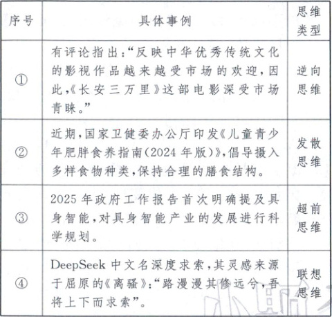 1. D 2025年政府工作报告首次提及具身智能并进行产业规划,体现了对未来趋势的预见和提前布局,运用了超前思维,③正确。DeepSeek中文名“深度求索”的灵感源自屈原《离骚》的诗句,将古典文化与现代科技进行联结,体现了联想思维,④正确。“反映中华优秀传统文