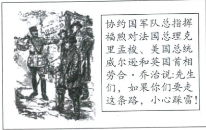 协约国军队总指挥福煦对法国总理克里孟梭、美国总统威尔逊和英国首相劳合·乔治说:先生们,如果你们要走这条路,小心踩雷!