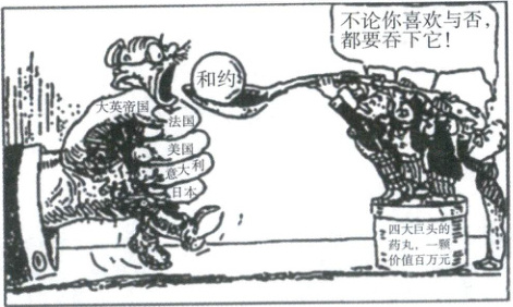 ③画面:写着“大英帝国”“法国”“美国”“意大利”“日本”的大手攥住一个人,另外一群小人从写着“四大巨头的药丸,一颗价值百万元”的桶里舀起一勺“和约”往被攥着的小人口里送,一边送一边说着“不论你喜欢与否,都要吞下它” |