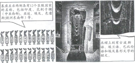 “衣褶上刻有古波斯语、埃兰语、巴比伦语和埃及象形文字的铭文” 波斯帝国的疆域包含了多个古文明区,推动了不同文明之间的交流