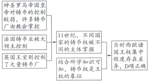 例2 (2024·重庆卷)11世纪,神圣罗马帝国皇帝对铸币的控制较弱,许多铸币厂由教会掌控,其发行的货币占主导地位。法国铸币业被大领主控制,货币的原料、工艺和设计都颇为粗劣。英国王室则控制了大量铸币厂,每三到六年便调整货币设计。这表明当时西欧诸国(