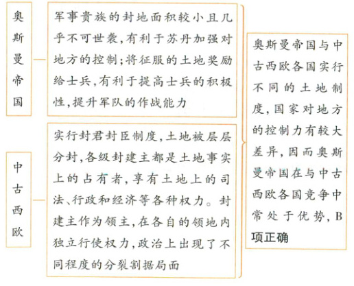错误项分析 奥斯曼帝国和中古西欧各国都属于封建社会,属于同一个社会形态,排除A项。材料没有提及双方的军事装备,排除C项。控制地域与军队作战能力关系不大,排除D项。