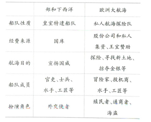 10 知识点4 下表是郑和下西洋和欧洲大航海的相关资料的对比。从社会发展的角度,对此解读最为全面的是(