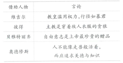2.B 由材料可知,但丁借维吉尔之言抨击教皇滥用权力,借彼得之言批判了教会的腐朽,借贝雅特丽齐之言歌颂自由意志,借奥德修斯之言主张人应追求美德与知识,这体现了但丁肯定人的尊严与价值,宣扬人性自由,强调理性与个体解放,故选B项。材料中有批判教会的内容,但由贝雅特丽齐的言论可以看出但丁并未否定宗教信仰,排除A项。材料宣扬自由意志和个人追求,但未涉及民主思想,排除C项。材料批判了教会的腐朽,但未涉及倡导禁欲苦行,且后者是教会的主张,是但丁所反对的,排除D项。