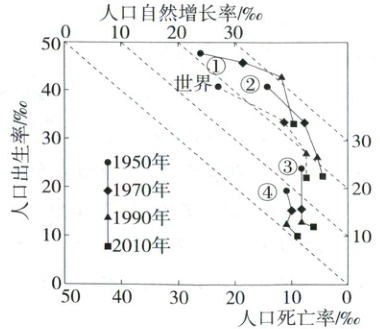 10.B 由图可知,1950—1970年世界人口死亡率下降幅度最大,A错误;1950—1990年世界人口自然增长率先明显超过20‰,后回落到20‰以下,先升后降,B正确;1970—2010年,世界人口出生率一直在20‰以上,但世界人口死亡率没有超过10‰,C错误;1990—2010年世界人口出生率呈下降趋势,降幅较大,D错误。