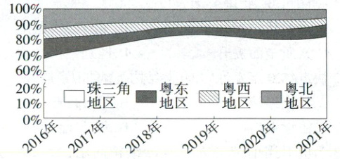 从20世纪80年代开始,我国出现了大规模的人口流动,既促进了城市社会经济发展,又加强了城乡联系,还带动了农村经济发展,同时也带来了一些不利的影响。广东省经济发达,近年来吸引了大量人口迁入。下图为2016—2021年广东省不同区域人口迁入占比变化图。