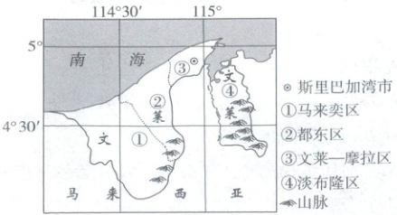 创新题 新考法 文莱位于加里曼丹岛北部,被马来西亚的沙捞越州分隔为不相连的东西两部分。东部地势较高,西部多沼泽,首都斯里巴加湾市是文莱最大的城市。文莱森林茂密,覆盖率达72.11%。全国共划分为四个行政区,下图为文莱四个行政区分布图。据此完成下面两题。